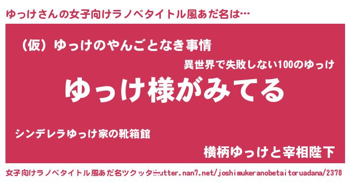 | 男性向けラノベタイトル風あだ名 | 『ゆっけの嫁は女の子じゃないと思った?』 |