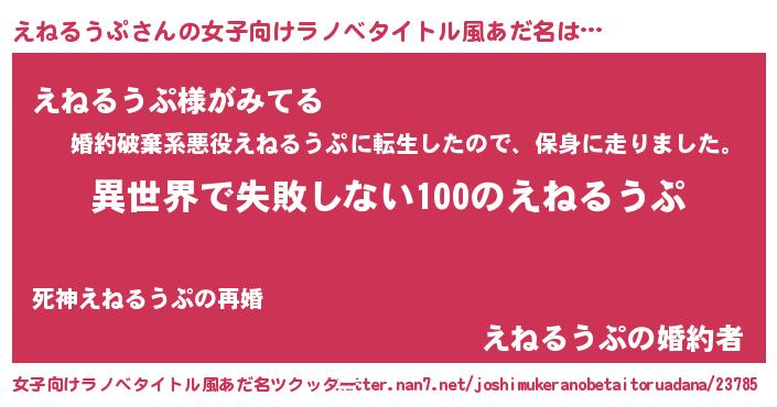 | 男性向けラノベタイトル風あだ名 | 『えねるうぷという概念が存在しない退屈な世界 』 |