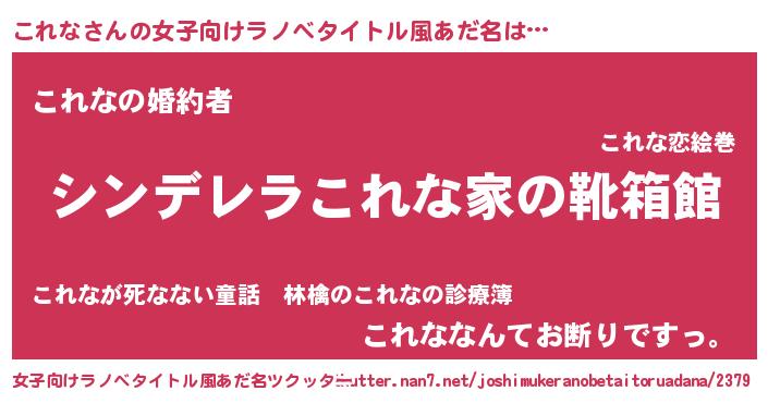これなさんの女子向けラノベタイトル風あだ名は… 『シンデレラこれな家の靴箱館』『これなの婚約者』『これななんてお断りですっ。』 ツクッター #女子向けラノベタイトル風あだ名ツクッター http://tkutter.nan7.net/joshimukeranobetaitoruadana/2379/