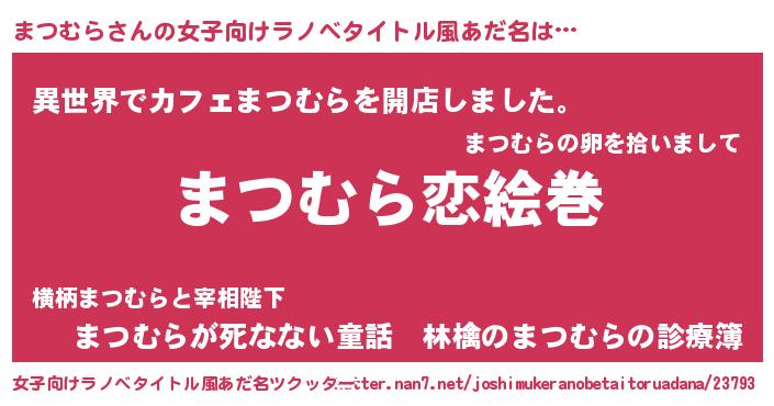 | 男性向けラノベタイトル風あだ名 | 『おまえをオタクにしてやるから、俺をまつむらにしてくれ! 』 |