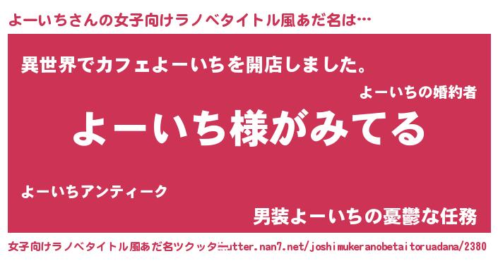 | 男性向けラノベタイトル風あだ名 | 『よーいちの嫁は女の子じゃないと思った?』 |
