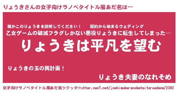 | 男性向けラノベタイトル風あだ名 | 『ダンジョンにりょうきを求めるのは間違っているだろうか』 |
