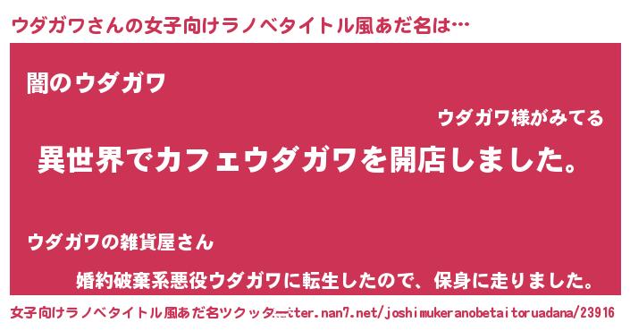 | 男性向けラノベタイトル風あだ名 | 『誰もが恐れるあのウダガワが、ぼくの専属メイドになるようです。』 |