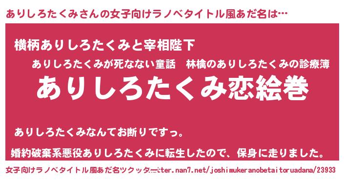 | 男性向けラノベタイトル風あだ名 | 『ノーゲーム・ノーアリシロタクミ』 |