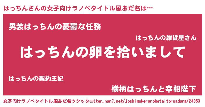 はっちんさんの女子向けラノベタイトル風あだ名は… 『はっちんの卵を拾いまして』『男装はっちんの憂鬱な任務』『横柄はっちんと宰相陛下』 ツクッター #女子向けラノベタイトル風あだ名ツクッター http://tkutter.nan7.net/joshimukeranobetaitoruadana/24053/
