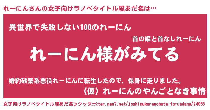 | 男性向けラノベタイトル風あだ名 | 『れーにんの嫁は女の子じゃないと思った?』 |