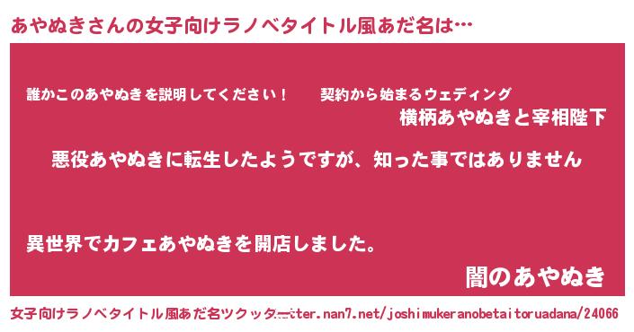 | 男性向けラノベタイトル風あだ名 | 『この素晴らしい世界にあやぬきを!』 |