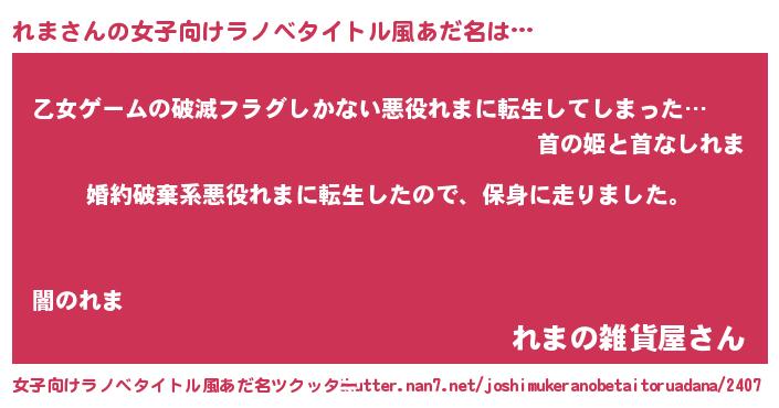 | 男性向けラノベタイトル風あだ名 | 『レマスレイヤー』『魔弾の王とれま』 |