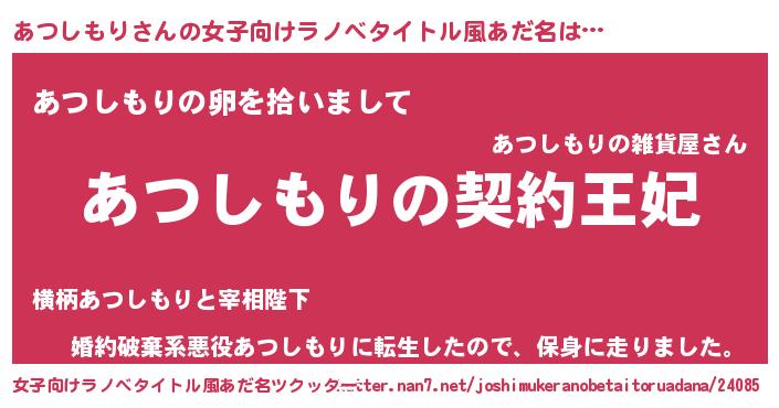 | 男性向けラノベタイトル風あだ名 | 『誰もが恐れるあのあつしもりが、ぼくの専属メイドになるようです。』 |