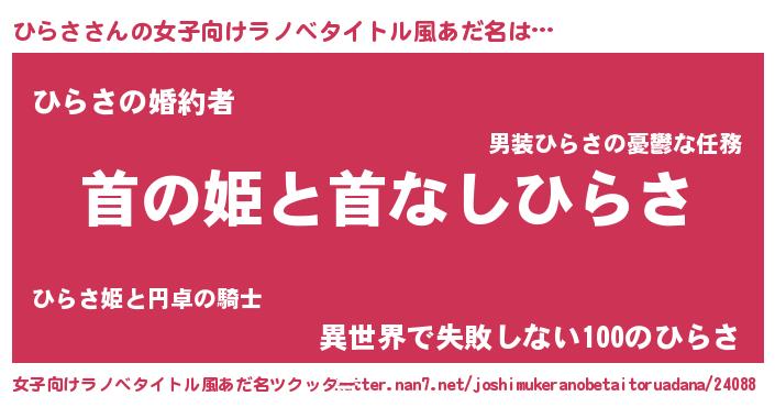 | 男性向けラノベタイトル風あだ名 | 『はたらくひらささま!』『ひらさの憂鬱』 |