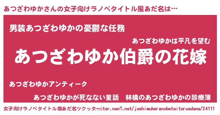 | 男性向けラノベタイトル風あだ名 | 『やはりあつざわゆかの青春ラブコメはまちがっている 』 |