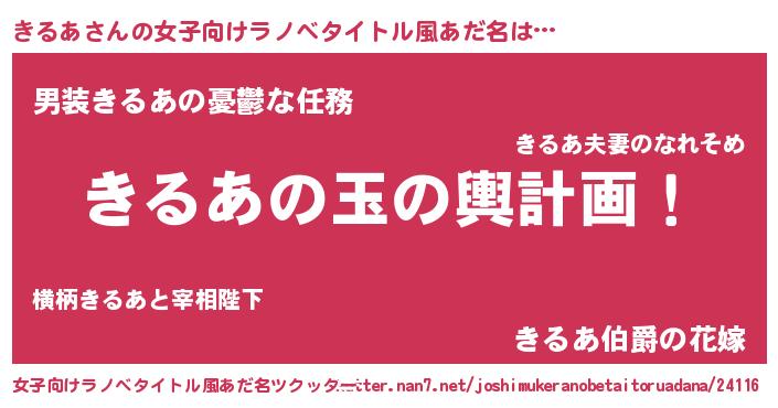 | 男性向けラノベタイトル風あだ名 | 『きるあ~年齢イコール彼女いない歴の魔法使い~』 |