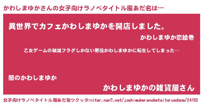 | 男性向けラノベタイトル風あだ名 | 『この素晴らしい世界にかわしまゆかを!』 |