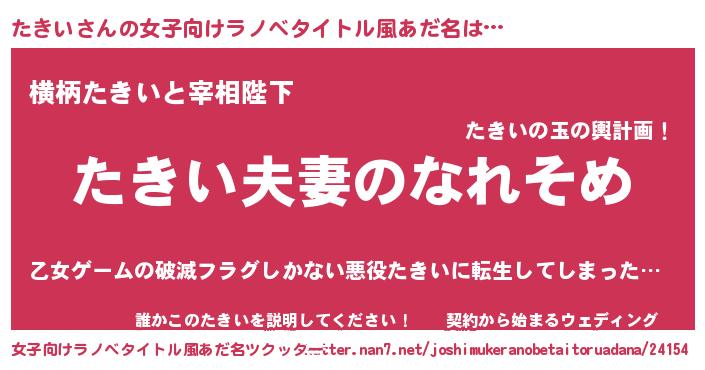たきいさんの女子向けラノベタイトル風あだ名は… 『たきい夫妻のなれそめ』『横柄たきいと宰相陛下』『誰かこのたきいを説明してください! ~契約から始まるウェディング~』 ツクッター #女子向けラノベタイトル風あだ名ツクッター http://tkutter.nan7.net/joshimukeranobetaitoruadana/24154/