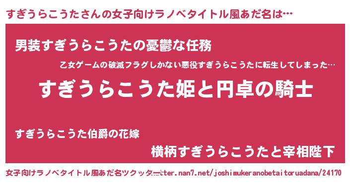 | 男性向けラノベタイトル風あだ名 | 『スギウラコウタアートオンライン』 |