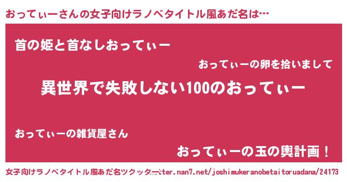 | 男性向けラノベタイトル風あだ名 | 『おってぃーという概念が存在しない退屈な世界 』 |