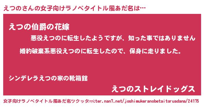 | 男性向けラノベタイトル風あだ名 | 『エツノスレイヤー』『緋弾のエツノ』 |