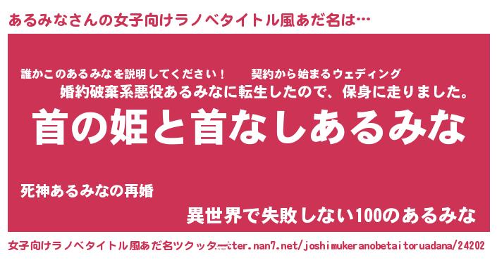 あるみなさんの女子向けラノベタイトル風あだ名は… 『首の姫と首なしあるみな』『誰かこのあるみなを説明してください! ~契約から始まるウェディング~』『異世界で失敗しない100のあるみな』 ツクッター #女子向けラノベタイトル風あだ名ツクッター http://tkutter.nan7.net/joshimukeranobetaitoruadana/24202/