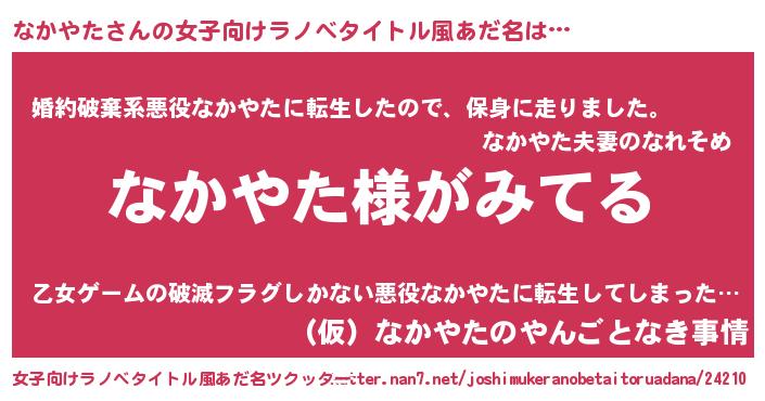 | 男性向けラノベタイトル風あだ名 | 『なかやたの嫁は女の子じゃないと思った?』 |