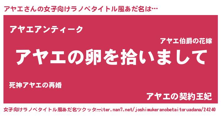 | 男性向けラノベタイトル風あだ名 | 『アヤエの嫁は女の子じゃないと思った?』 |