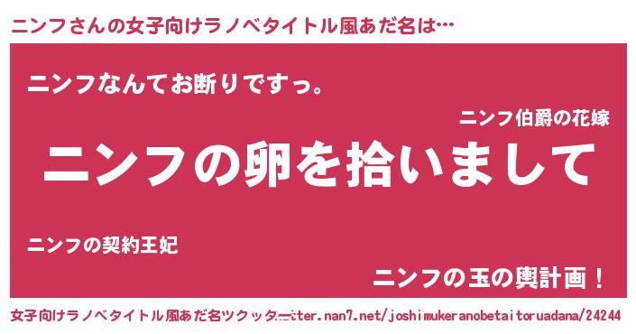 | 男性向けラノベタイトル風あだ名 | 『ニンフの嫁は女の子じゃないと思った?』 |