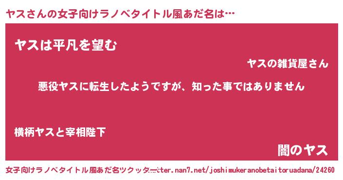 | 男性向けラノベタイトル風あだ名 | 『この素晴らしい世界にヤスを!』 |