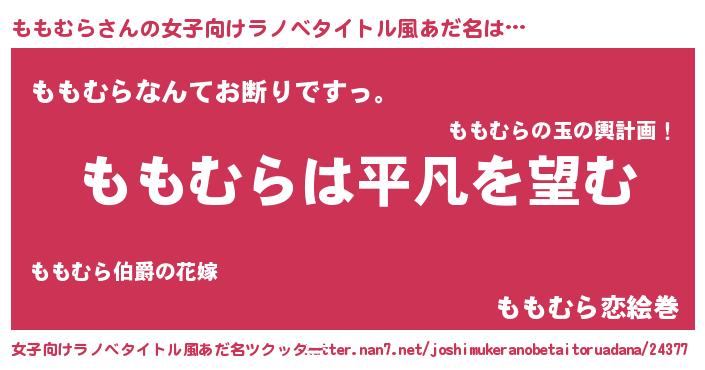 ももむらさんの女子向けラノベタイトル風あだ名は… 『ももむらは平凡を望む』『ももむらなんてお断りですっ。』『ももむら恋絵巻』 ツクッター #女子向けラノベタイトル風あだ名ツクッター http://tkutter.nan7.net/joshimukeranobetaitoruadana/24377/
