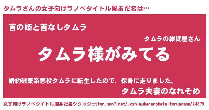 | 男性向けラノベタイトル風あだ名 | 『タムラの嫁は女の子じゃないと思った?』 |