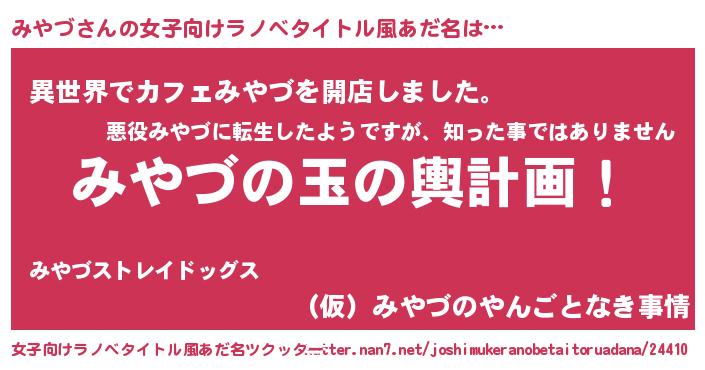 | 男性向けラノベタイトル風あだ名 | 『転生したらみやづだった件』 |