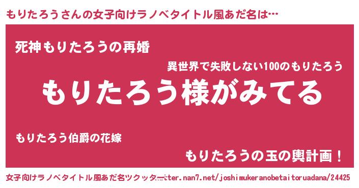 | 男性向けラノベタイトル風あだ名 | 『もりたろうの嫁は女の子じゃないと思った?』 |