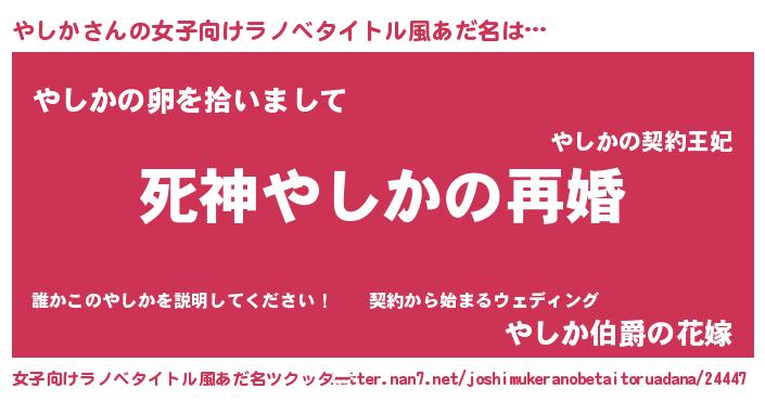 やしかさんの女子向けラノベタイトル風あだ名は… 『死神やしかの再婚』『やしかの卵を拾いまして』『やしか伯爵の花嫁』 ツクッター #女子向けラノベタイトル風あだ名ツクッター http://tkutter.nan7.net/joshimukeranobetaitoruadana/24447/