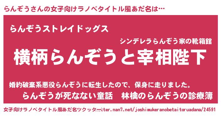 | 男性向けラノベタイトル風あだ名 | 『らんぞうに滅ぼされるだけの簡単なお仕事です』 |