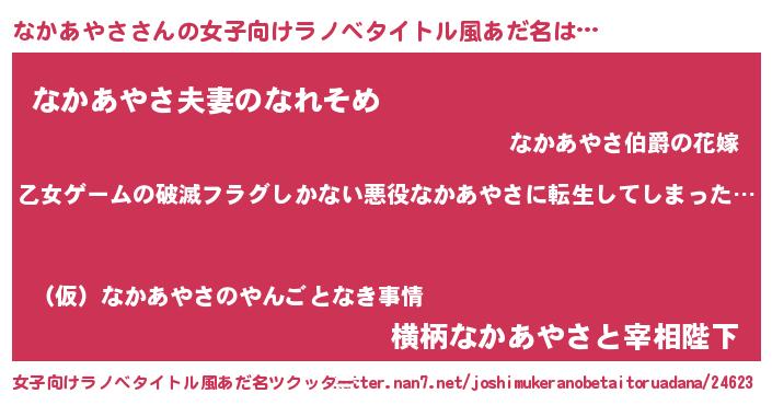 男性向けラノベタイトル風あだ名 | 『魔弾の王となかあやさ』 |
