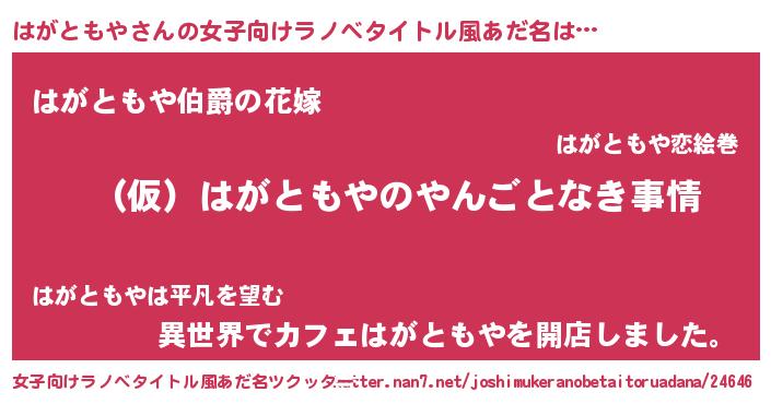 | 男性向けラノベタイトル風あだ名 | 『はがともやの憂鬱』 |