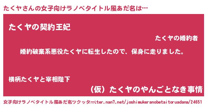 | 男性向けラノベタイトル風あだ名 | 『転生したらたくヤだった件』 |