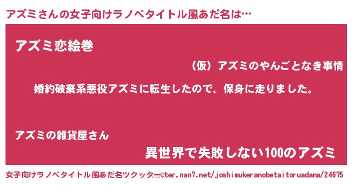 | 男性向けラノベタイトル風あだ名 | 『転生したらアズミだった件』 |