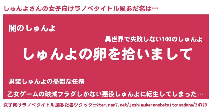 | 男性向けラノベタイトル風あだ名 | 『ダンジョンにしゅんよを求めるのは間違っているだろうか』 |