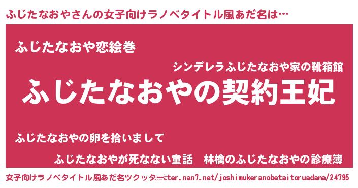 ふじたなおやさんの女子向けラノベタイトル風あだ名は… 『ふじたなおやの契約王妃』『ふじたなおや恋絵巻』『ふじたなおやが死なない童話 林檎のふじたなおやの診療簿』 ツクッター #女子向けラノベタイトル風あだ名ツクッター http://tkutter.nan7.net/joshimukeranobetaitoruadana/24795/