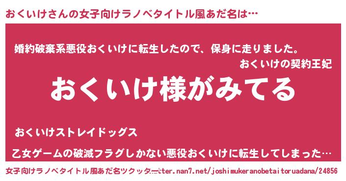 | 男性向けラノベタイトル風あだ名 | 『おくいけの嫁は女の子じゃないと思った?』 |