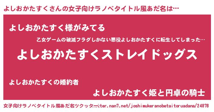 よしおかたすくさんの女子向けラノベタイトル風あだ名は… 『よしおかたすくストレイドッグス』『よしおかたすく様がみてる』『よしおかたすく姫と円卓の騎士』 ツクッター #女子向けラノベタイトル風あだ名ツクッター http://tkutter.nan7.net/joshimukeranobetaitoruadana/24878/