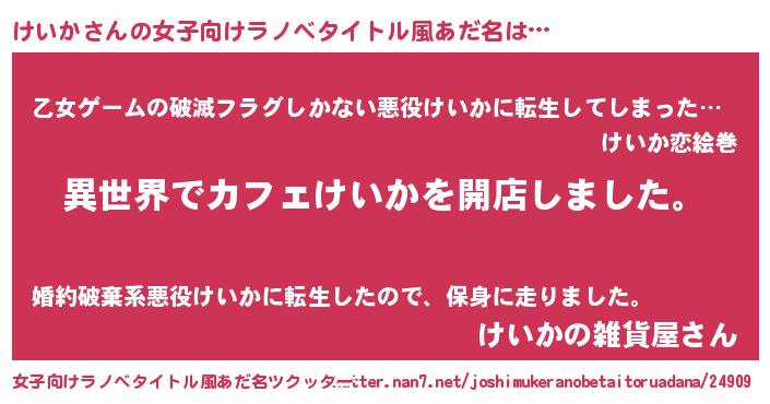| 男性向けラノベタイトル風あだ名 | 『誰もが恐れるあのけいかが、ぼくの専属メイドになるようです。』 |
