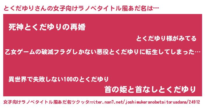 | 男性向けラノベタイトル風あだ名 | 『魔弾の王ととくだゆり』 |