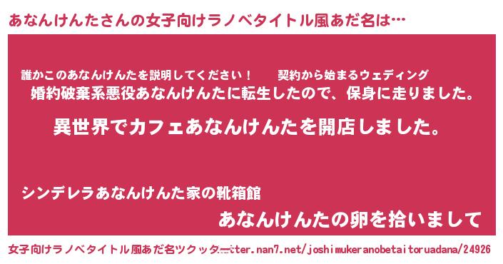 | 男性向けラノベタイトル風あだ名 | 『誰もが恐れるあのあなんけんたが、ぼくの専属メイドになるようです。』 |