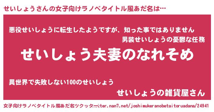 | 男性向けラノベタイトル風あだ名 | 『おまえをオタクにしてやるから、俺をせいしょうにしてくれ! 』 |