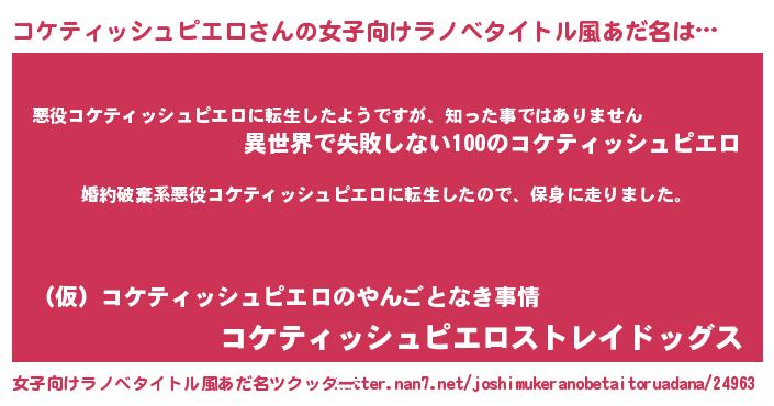 | 男性向けラノベタイトル風あだ名 | 『コケティッシュピエロスレイヤー』 |