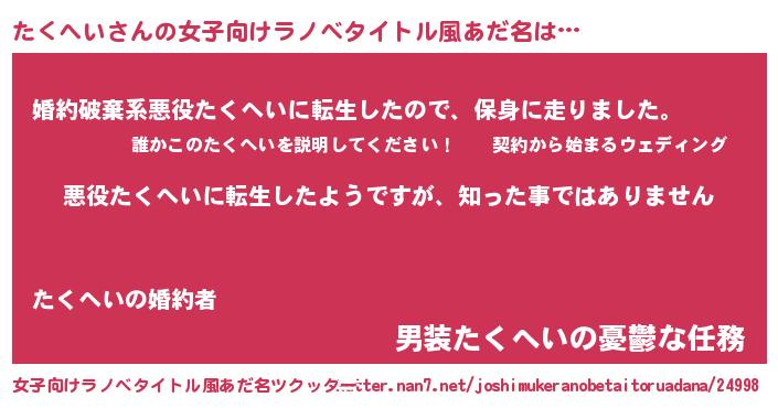 | 男性向けラノベタイトル風あだ名 | 『この素晴らしい世界にたくへいを!』 |