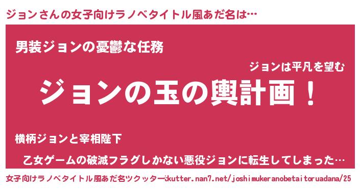 | 胡散臭い通販商品みたいなあだ名 | 『あなたにだけ特別に提供する世界で10本だけ現存している希少なブランデー…その名も「ジョン」』 |