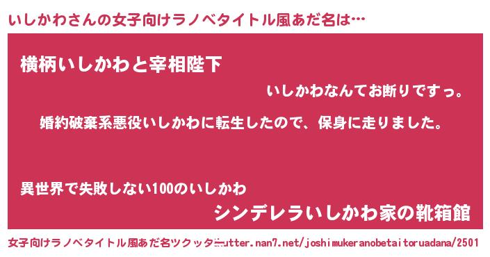 | 男性向けラノベタイトル風あだ名 | 『イシカワスレイヤー』『緋弾のイシカワ』 |