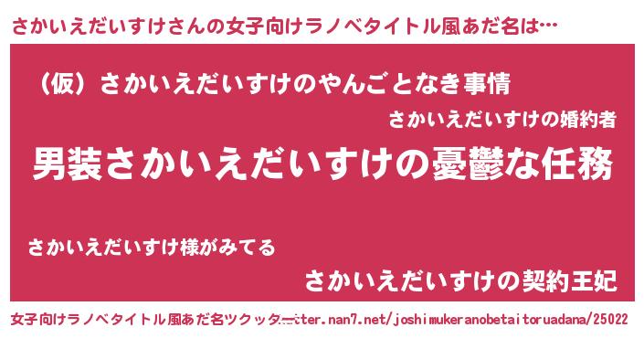 | 男性向けラノベタイトル風あだ名 | 『うちのさかいえだいすけが世界を掌握している!』 |