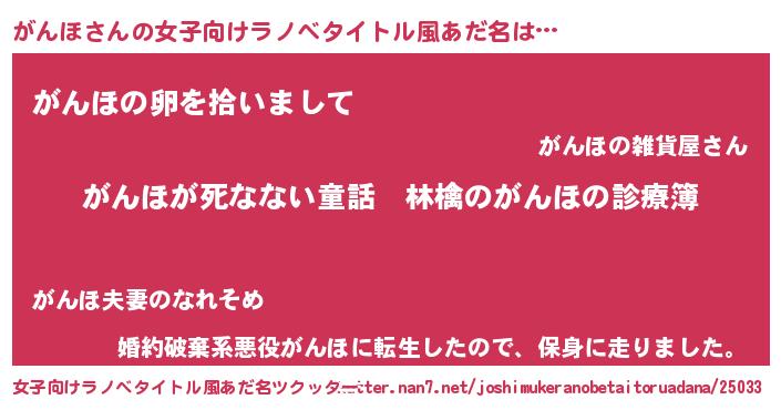 がんほさんの女子向けラノベタイトル風あだ名は… 『がんほが死なない童話 林檎のがんほの診療簿』『がんほの卵を拾いまして』『婚約破棄系悪役がんほに転生したので、保身に走りました。』 ツクッター #女子向けラノベタイトル風あだ名ツクッター http://tkutter.nan7.net/joshimukeranobetaitoruadana/25033/